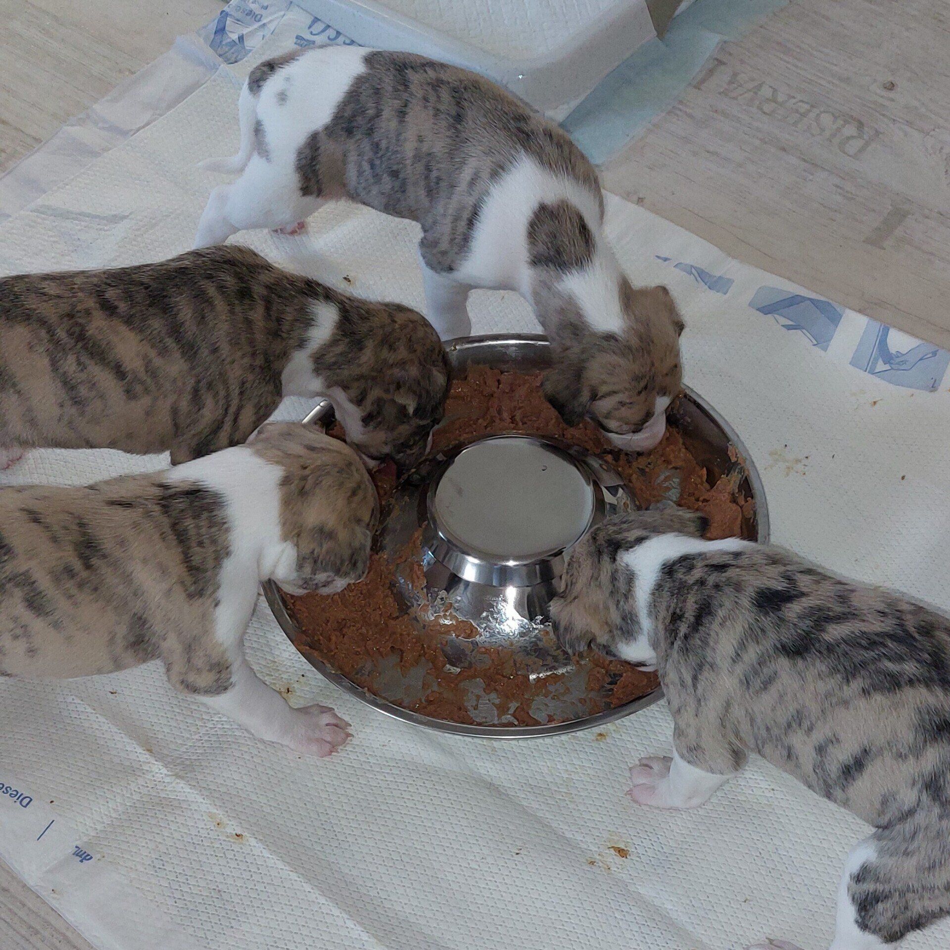 Heute sind die kleinen Diamonds schon 4 Wochen alt. Mittlerweile gab es schon die erste Nahrung ausser Muttis Milch, was auch sehr gut angenommen wurde, es gab lecker Rinderhack und ab heute eingeweichtes Welpenfutter, welches ratz fatz verschlungen wurde, danach wurde sich dennoch ein Schluck an Mamas Milchbar gegönnt ;-)
