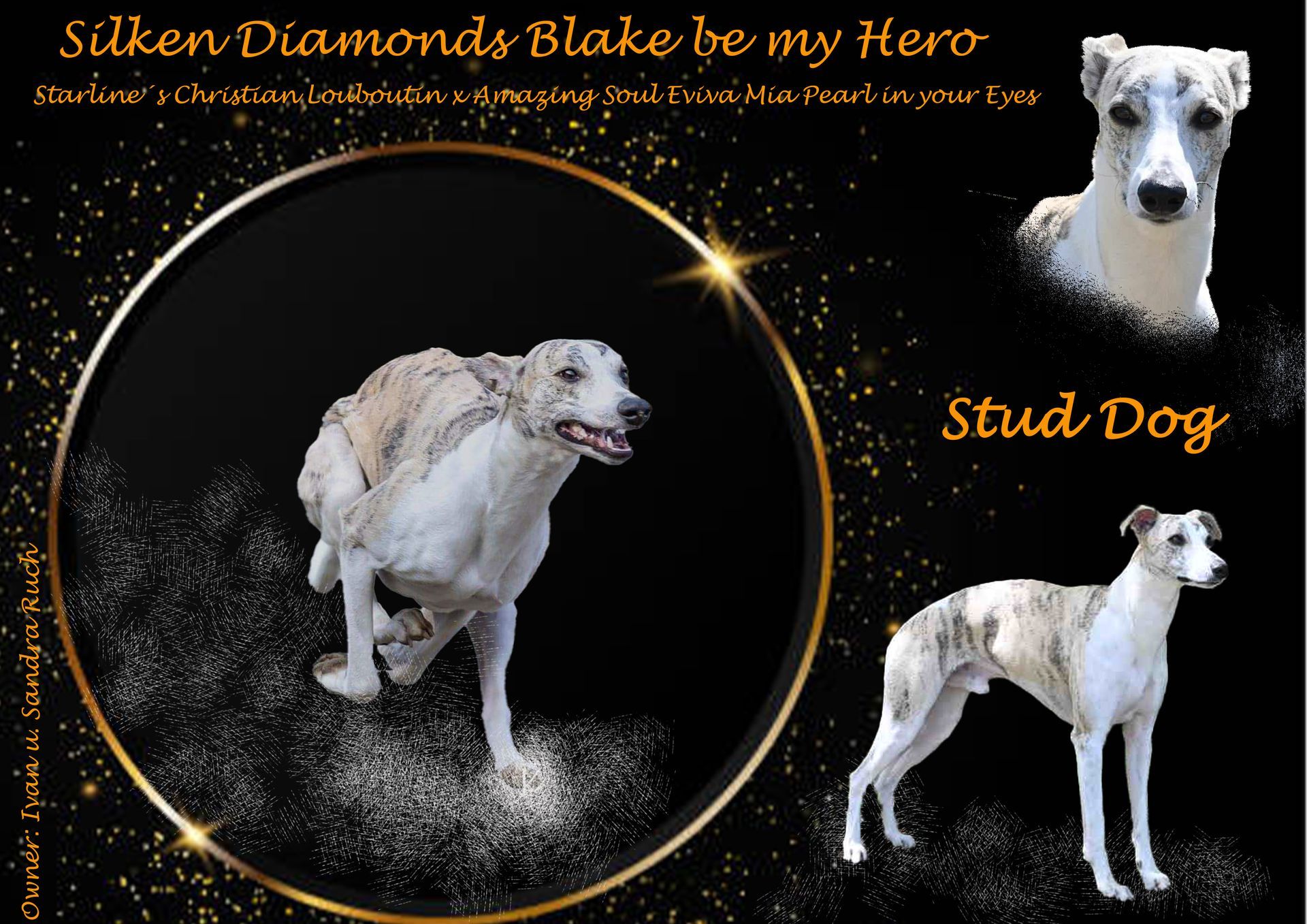 Am Monatg haben wir uns mit unserer Amazing Soul Glenda Heart of dark Angel "Phoebe" auf den Weg zu Bertrand Hoh und seinen wundervollen und charmanten Rüden Starline´s Field of Gold " Ryan " nach Frankreich gemacht. Ryan ist mehrfacher Schönheits Champion, er ist ein charmanter und sehr liebevoller Rüde. Mit dieser tollen Verbindung mit viel amerikanischem Blut erwarten wir uns charakterstarke und Typvolle Whippetwelpen. Wenn alles gut läuft , dürfen wir zur Sylvesterzeit mit den kleinen Silken Diamonds rechnen. Nun beginnt wieder eine sehr spannende Zeit auf die wir uns sehr freuen.