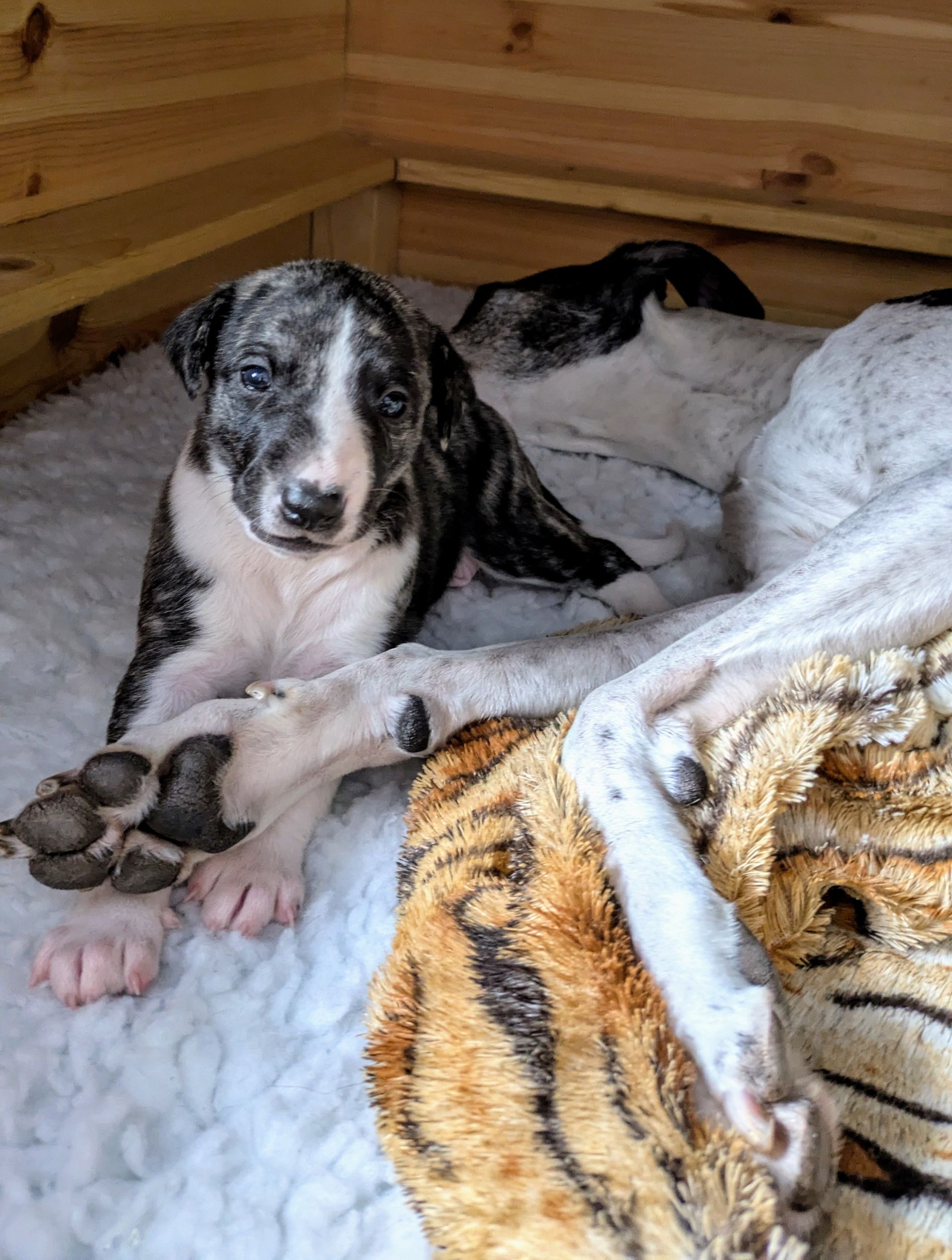 Phoebe hat pünktlich zu Silvester am 31..12.2024 ihre Welpen geboren. 2 Rüden und 1 Mädchen. Allen Welpen und auch unsere Phoebe gehts es prächtig und nun wird fleisig an der Milchbar getrunken und geschmatzt.