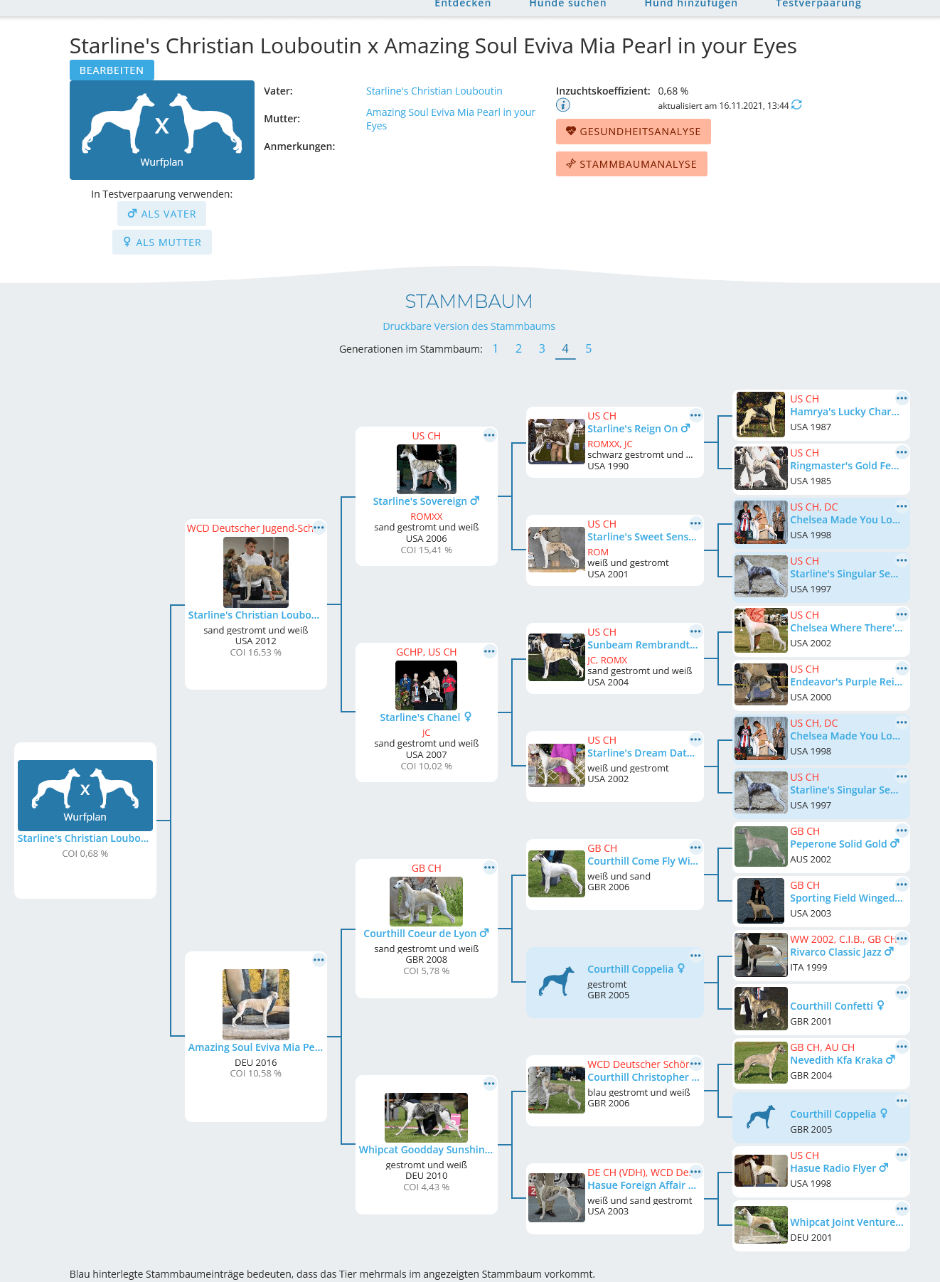 Heute war der große Tag. Die Reise mit unserer Mia ging nach Frankreich zu Bertrand Hoh, dessen toller und charmanter Rüde Starline´s Christian Louboutin unsere Hündin deckte. Mit dieser sagenhaften tollen Verbindung aus englischen und amerikanischen Linien erwarten wir uns charakterstarke und typvolle Whippetwelpen.